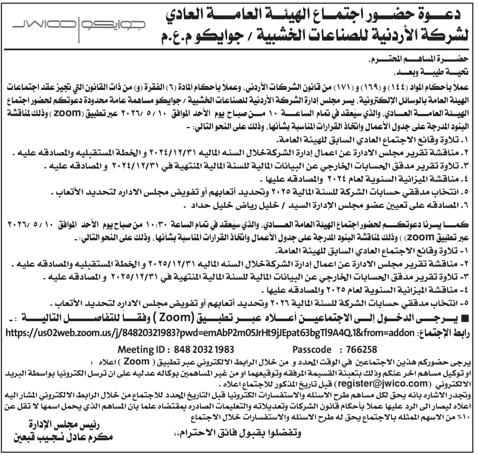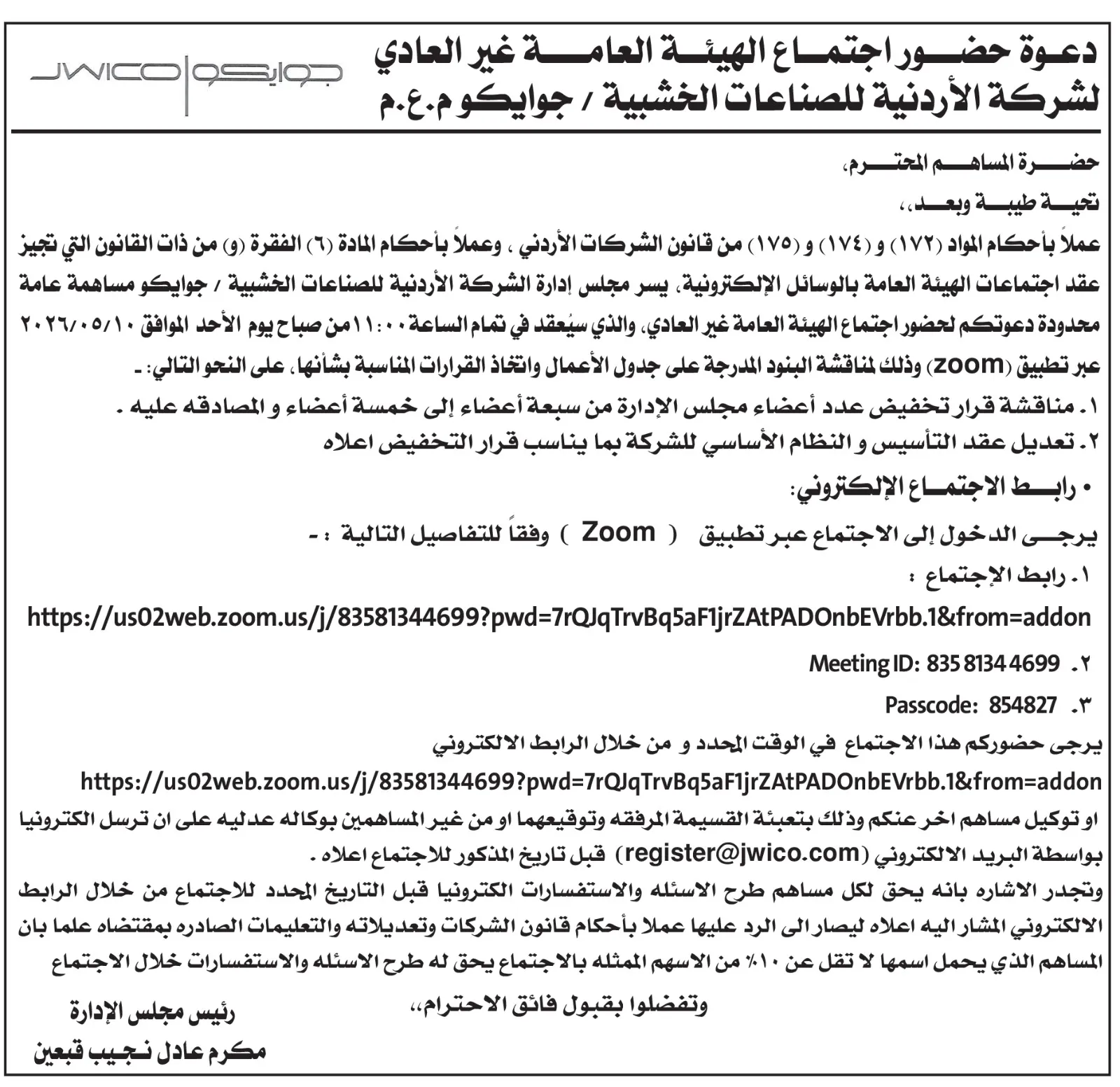 تعلن الشركة الأردنية للصناعات الخشبية/جوايكو المساهمة العامة المحدودة